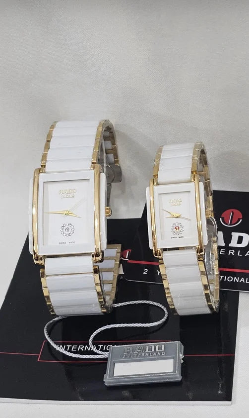 Rado cütlük saatları isə iki insanın zaman içindəki harmoniya və bağını simvolizə edir.Şüşə kimi parlaq keramik bantı, qızılı detalları və zərif kvadrat dizaynı ilə Rado — lüksü və sevgini eyni anda üzünüzə daşıyır.